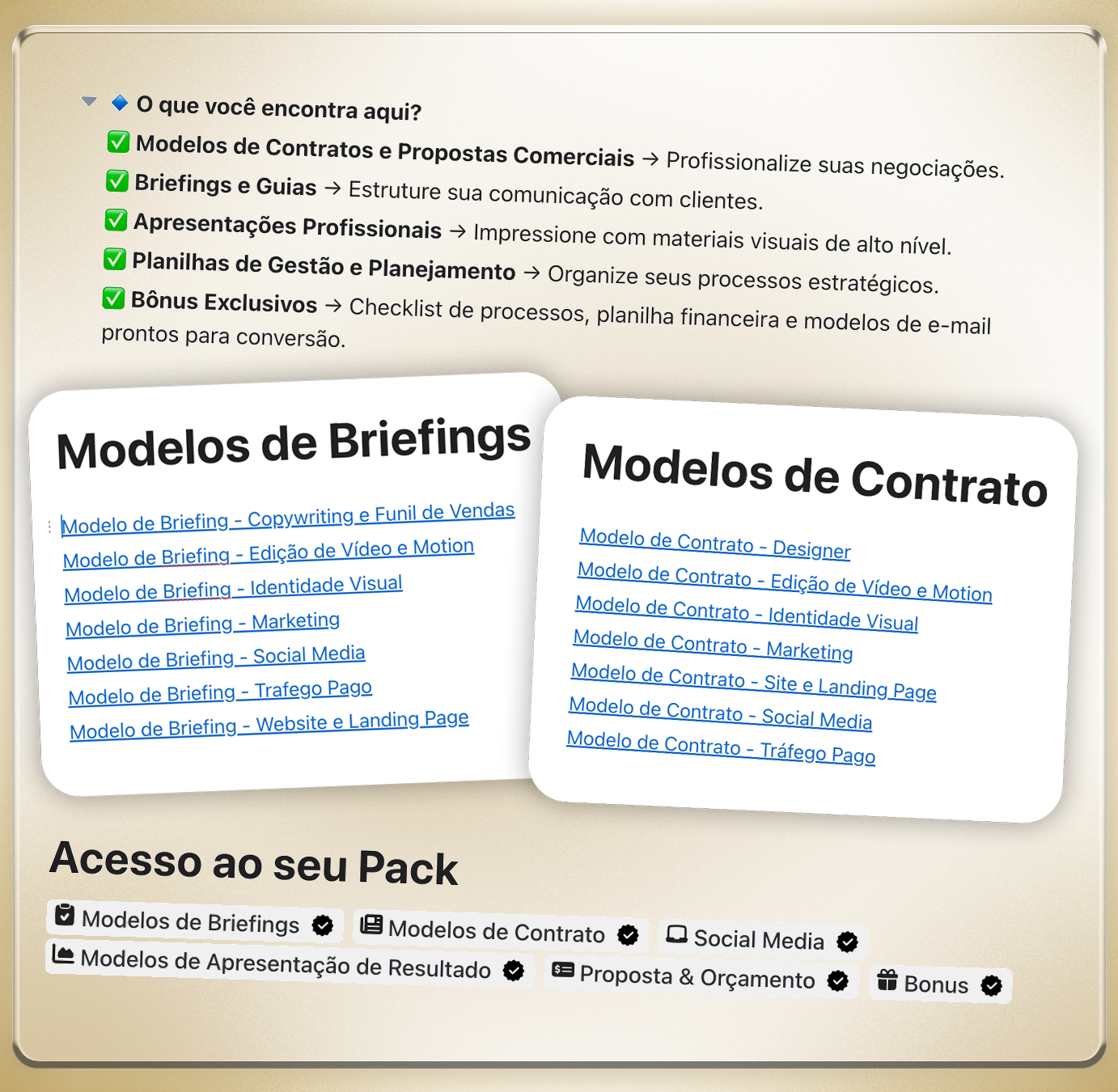 O Trinu Pack é um kit de templates profissionais prontos para freelancers, designers, social media e agências. Ele inclui contratos, propostas, apresentações, briefings, planilhas e muito mais — tudo 100% editável.